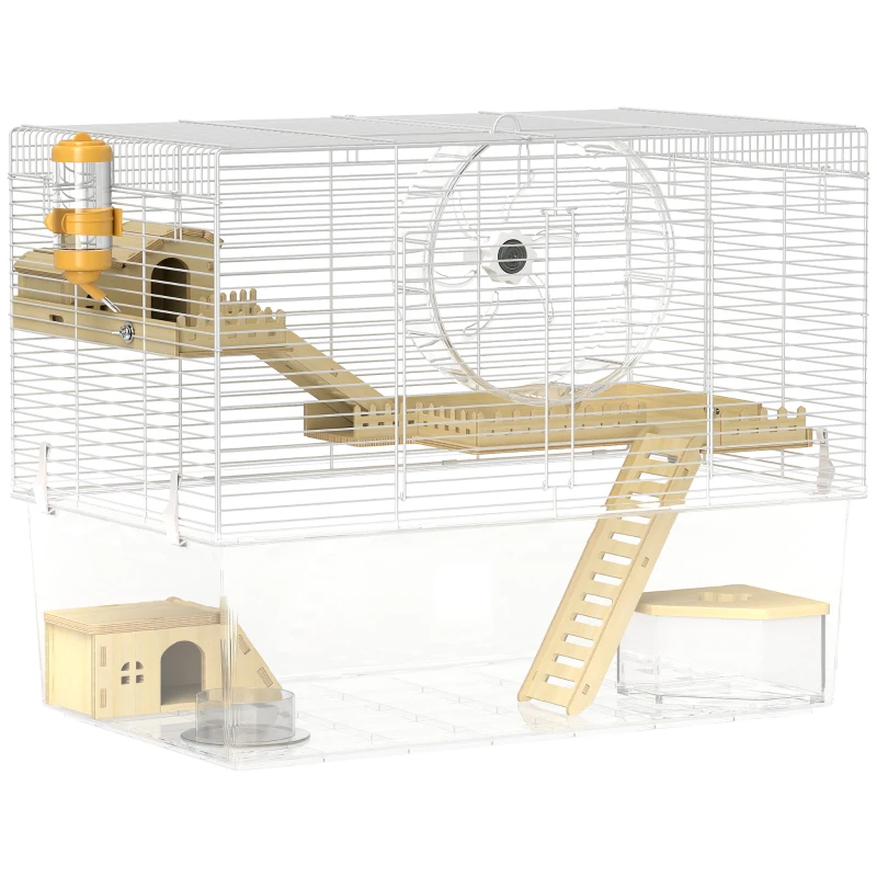 PawHut Gaiola para Hamster 3 Níveis Base Transparente Profunda e Roda Ø23,5 cm 59x35,5x47 cm Branco
